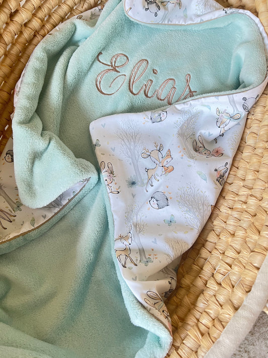 Kuscheldecke hellgrün/mint „Baby Waldtiere“ (einen Namen sticken ist gratis!)