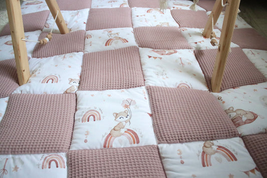 Krabbeldecke Patchwork „Baby Waldtiere+Waffelpique rosa/nude“