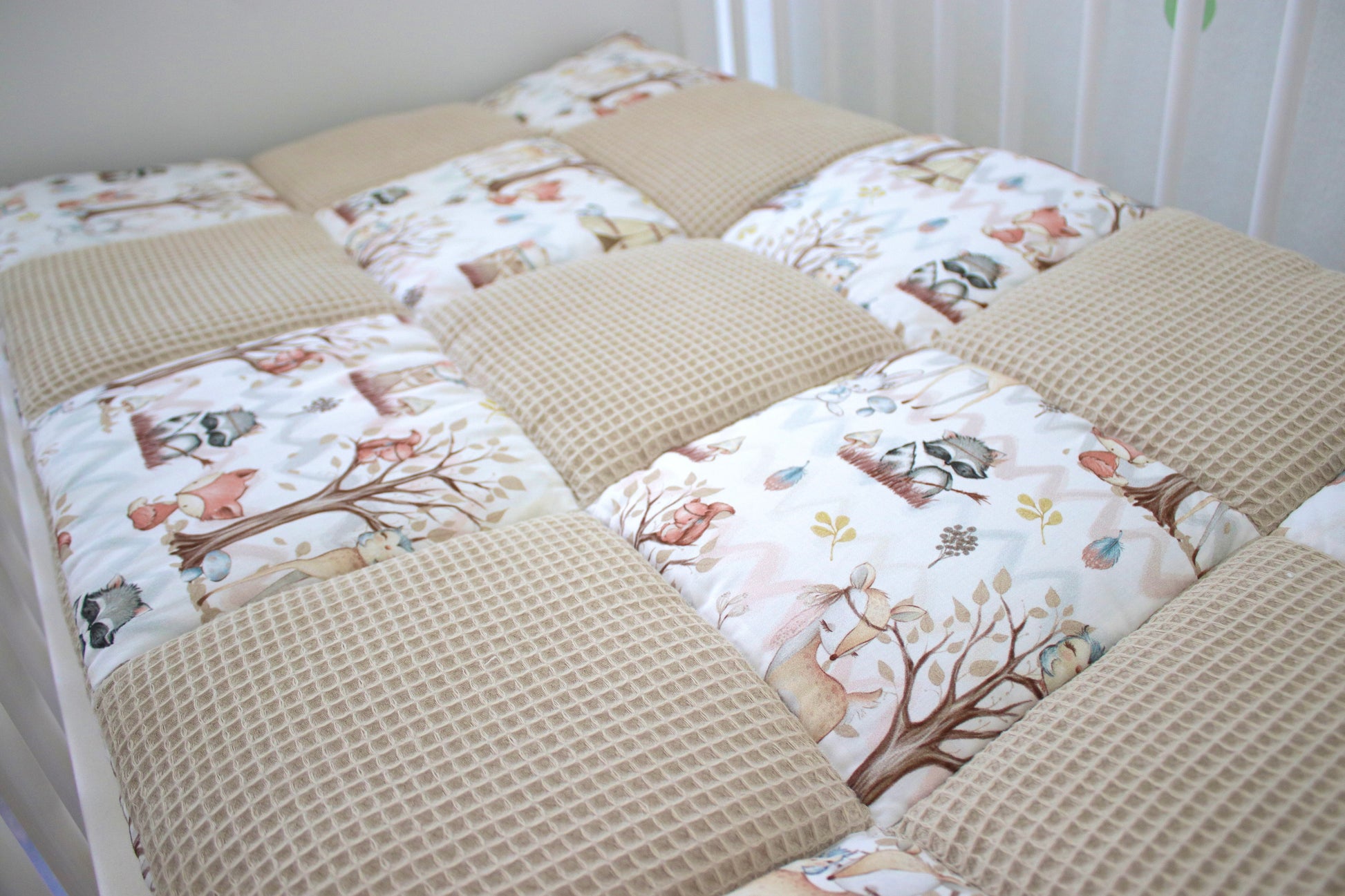 Krabbeldecke Patchwork „Waldtiere+Waffelpique hellbeige“
