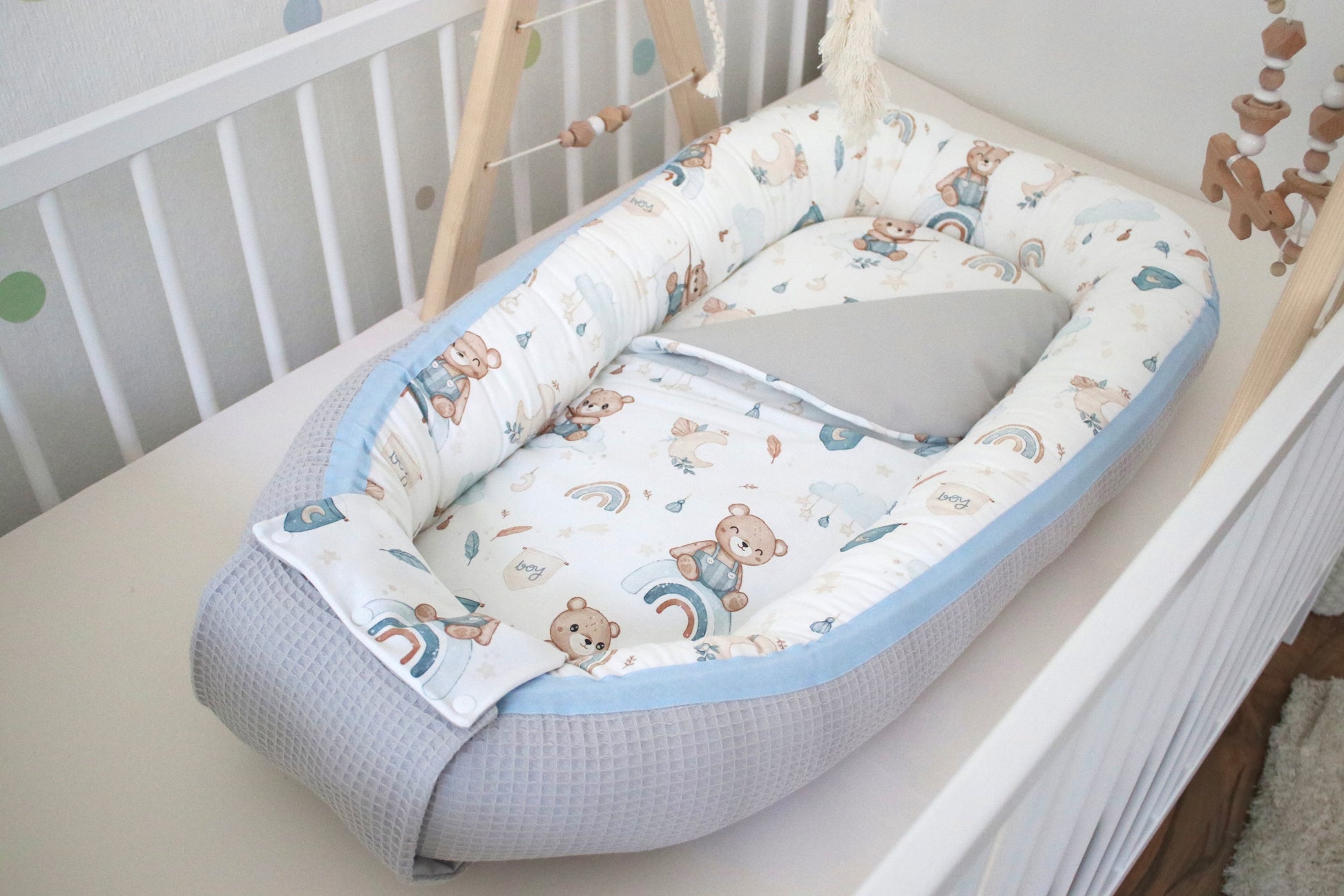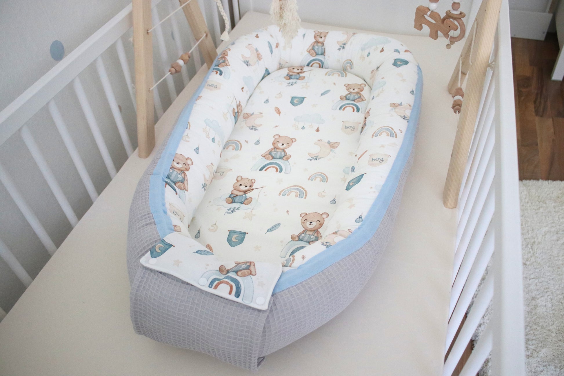 Die Babynestchen geben durch ihre weiche Begrenzung das Gefühl von Schutz und die Sicherheit, welche es aus dem Mutterleib kennt. Somit sind sie der idealer Begleiter für die ersten Monate deines Babys. Nur unter Aufsicht eines Erwachsenen verwenden!
