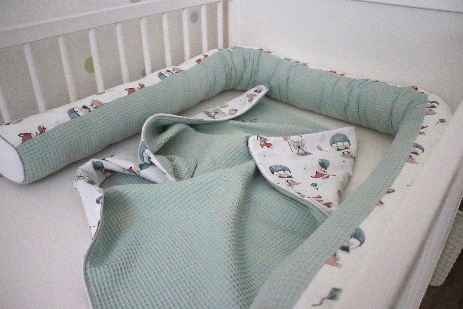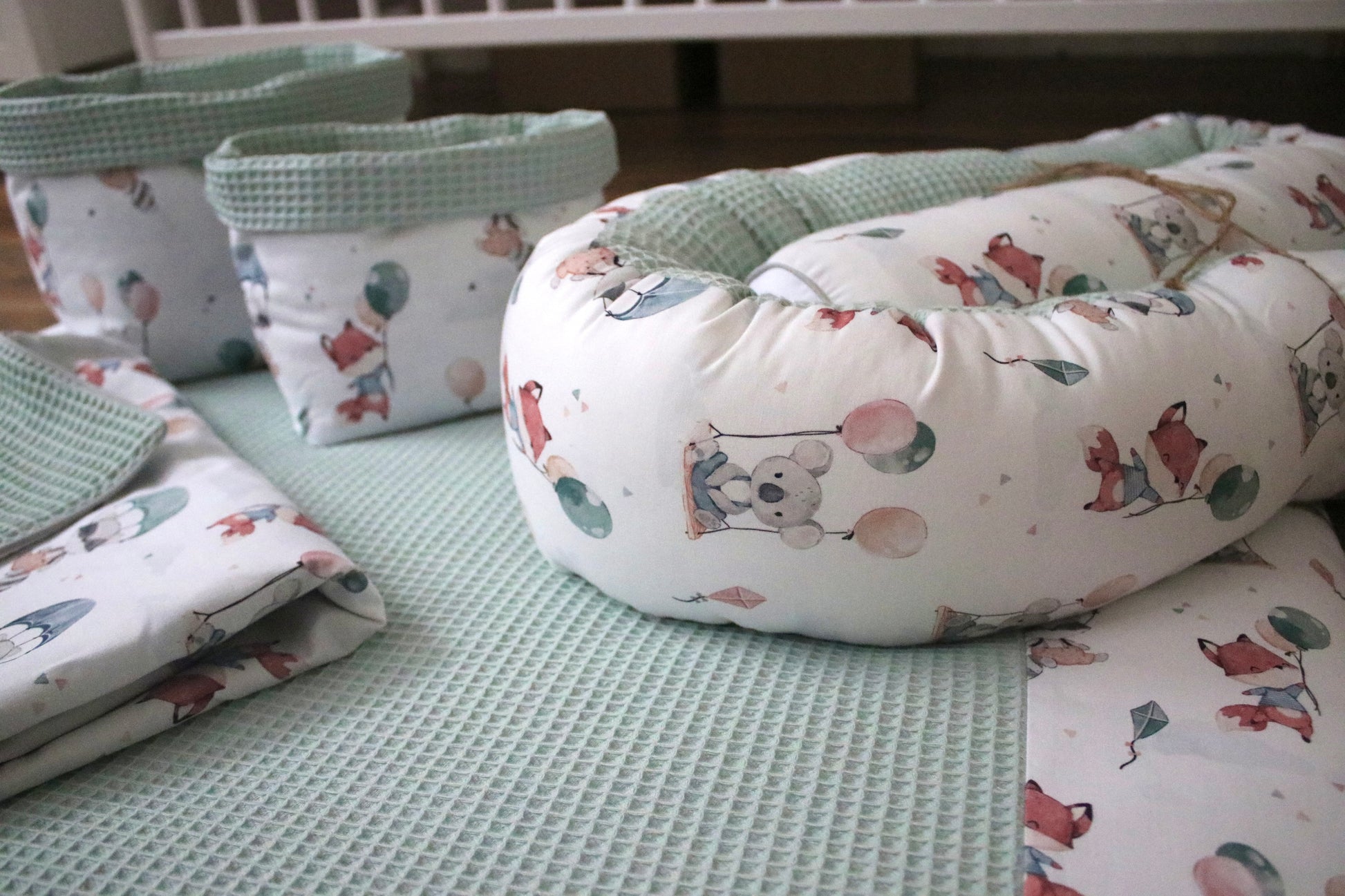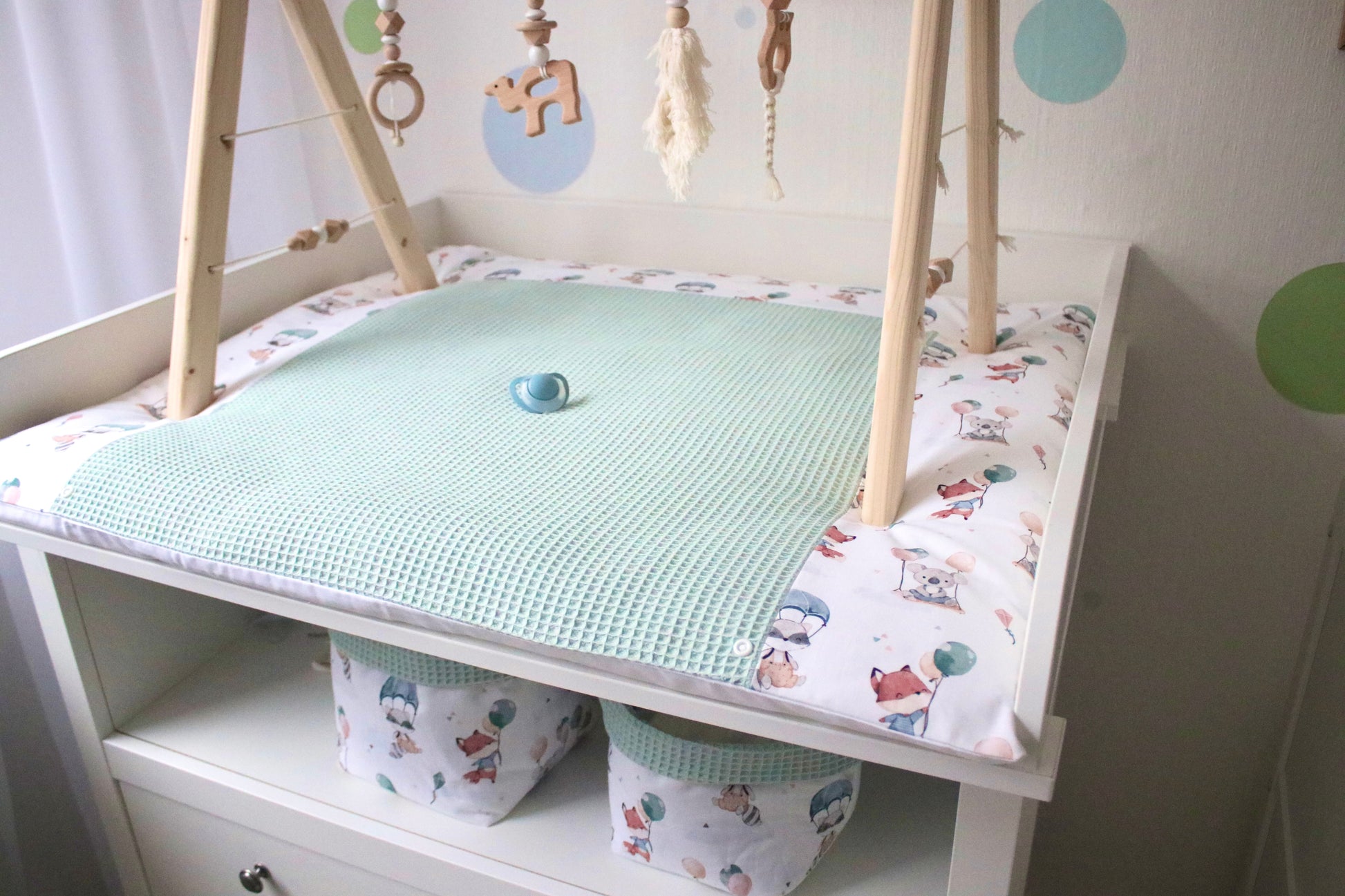 Wickelauflage Set „Tiere mit Luftballons+Waffelpique hellgrün/mint“