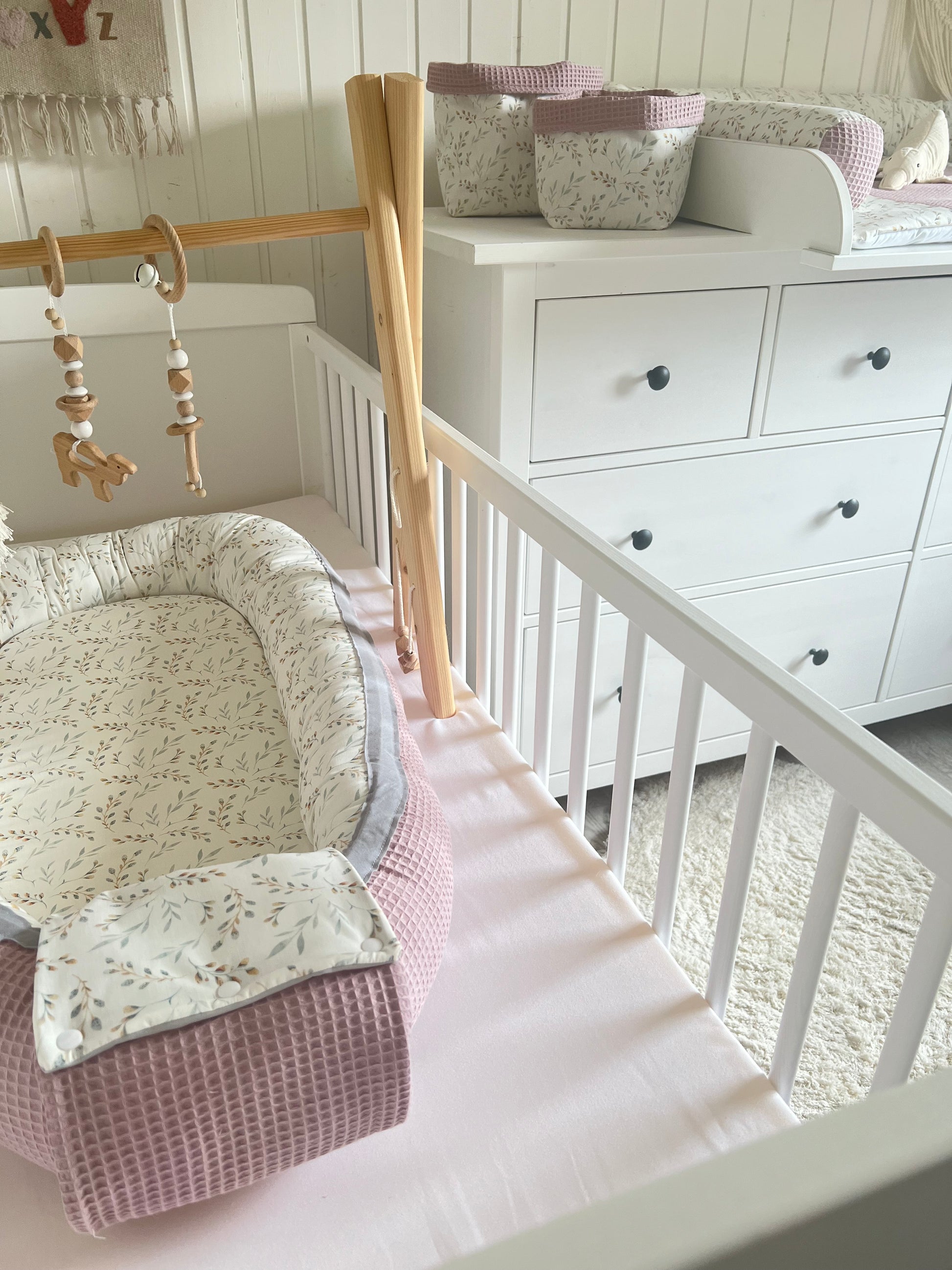 - die separate Auflagen, Bettschlange, Babydecke, Krabbeldecke sind waschbar bei 30°C ohne Weichspüler
